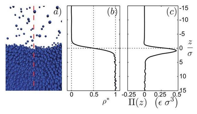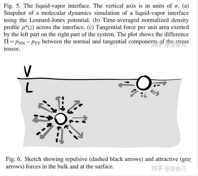 當分子間距較小時,斥力為主,分子間距較大時,引力為主。在斥力與引力平衡時,Lennard-Jones勢能最小。現在,我們就可以來詳細地考慮液-氣界面了。圖5a是通過分子動力學仿真得出的液-氣界面照片,對應的時間平均密度分布圖是圖5b。從高密度的液體到低密度的氣體發(fā)生在一個幾個分子厚度的窄區(qū)域。為了確定毛細力,我們沿垂直界面方向將系統分為兩個子系統(圖5a)。考慮左邊子系統對右邊子系統的單位面積的作用力,即應力,在豎直方向上的分布。這個力有兩個來源:壓力P和額外壓力Π(圖5c)。圖5c表明有個力局部存在于界面附近,其實這個力就是表面張力,且這個力范圍和密度突變的范圍很相似。這說明表面張力的確是一個真實的力,而不僅僅是表面能的一種純數學描述。既然我們發(fā)現在界面附近的確局部存在一個平行的力,那我們回到問題1,為什么表面張力平行于界面而不是垂直于界面?我們注意到圖1僅僅描繪了分子間引力作用。更全面的圖應該如圖6所示,包含了引力與斥力作用。在遠離界面的液體本體內,由于液體分子周圍的完全對稱性,分子的受力完全平衡。但是,靠近界面附近的地方,上下對稱性被打破。為修復豎直方向的力平衡,向上的斥力需平衡向下的引力。而在平行于界面的方向,對稱性仍然存在,平行于界面方向的力平衡仍然存在。這就可以存在一種情況,引力作用的強度與斥力作用的強度不同。實際上,在界面附近的水平方向上,引力作用比斥力更強,這產生了表面張力。