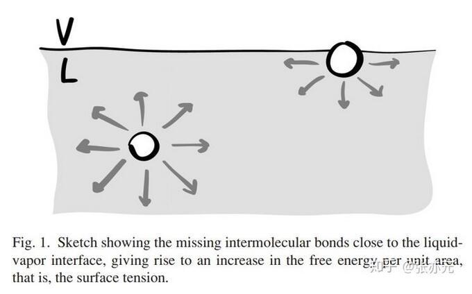 借鑒Gibbs的開創(chuàng)性工作,我們可以將表面張力理解成因兩本體相間界面存在導致的額外表面能。液-氣界面附近的液體分子所處的環(huán)境與本體中的分子不同,這種差異經常被人用圖1的示意圖表現,即近乎一半的分子間引力缺失,這導致自由能的增加,這是熱動力學的觀點。
