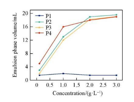 圖7示出4種表面活性劑對液體石蠟的乳化能力隨濃度的變化關系。P1由于較短的聚氧乙烯鏈段導致較差的親水性和乳化能力。隨著濃度的增加,P2,P3和P4的乳化性能逐漸提升,這是由于吸附在油/水界面上的表面活性劑分子數(shù)量隨著濃度的增加而增多,使分子形成的聚集體在界面處排列得更緊密,生成更致密、更剛性的油/水界面膜,從而使乳狀液也更加穩(wěn)定。具有長聚氧乙烯鏈的表面活性劑乳化性能更好,這是因為聚氧乙烯鏈的空間排斥作用可以防止乳液液滴聚并,有利于穩(wěn)定液滴。