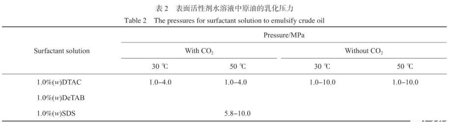 實驗中觀察到原油的乳化情況與體系壓力及CO2存在與否的相關性,表2是CO2存在與CO2不存在條件下,1.0~10.0 MPa范圍內,表面活性劑水溶液中原油的乳化壓力。50℃時,在DTAC水溶液/原油體系中,CO2不存在時,水靜壓在1.0~10.0 MPa范圍內,始終存在原油的乳化現(xiàn)象。CO2存在時,體系壓力低于4.0 MPa時,存在原油的乳化現(xiàn)象,隨著CO2壓力升高,油水界面張力增大,原油乳化現(xiàn)象消失。說明在DTAC水溶液/原油體系中,CO2的存在不利于原油的乳化。50℃時,在SDS水溶液/原油體系中,CO2不存在時,水靜壓從1.0 MPa升高至10.0 MPa過程中,始終未出現(xiàn)原油的乳化現(xiàn)象。CO2存在時,體系壓力升高到5.8 MPa以上,原油開始出現(xiàn)乳化、拉絲的現(xiàn)象。這說明CO2的存在有利于SDS水溶液乳化原油。其原因如下:一方面CO2的存在降低了SDS水溶液與原油的界面張力;另一方面,CO2通過水相擴散進入原油中,降低了原油的黏度,增強了原油的流動性,同時CO2對原油中輕質組分的萃取,也有助于原油中的輕質組分擴散進入水相。因此高壓CO2增強了SDS水溶液對原油的乳化作用。在DeTAB水溶液/原油體系中,油水界面張力較大,無論CO2存在與否,始終沒有原油乳化現(xiàn)象的發(fā)生。