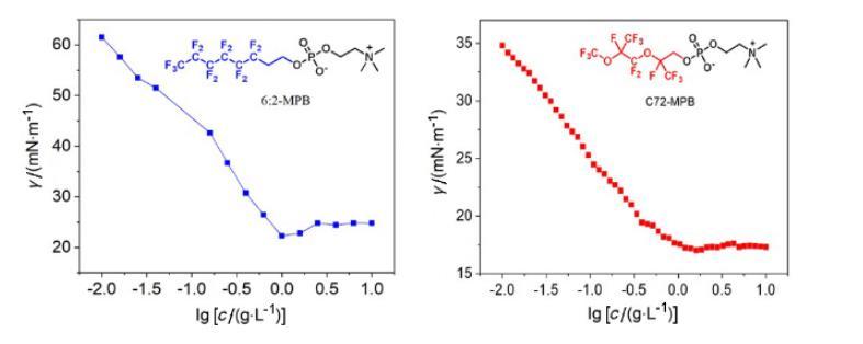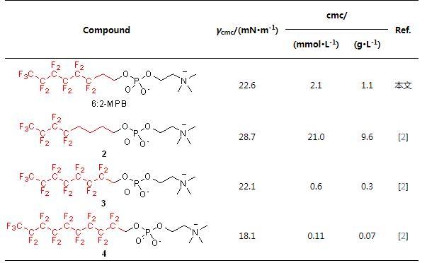 我們將文獻(xiàn)中的氟磷酸膽堿進(jìn)行對(duì)比,如表2所示,6:2-MPB與化合物2、3、4對(duì)比,疏水鏈段含氟量越高(2<6:2-MPB<3<4),降低表面張力的能力越強(qiáng),即γcmc越低。然而,對(duì)比化合物4與帶有氟醚疏水鏈段的C72-MPB,發(fā)現(xiàn)化合物4的含氟量大于C72-MPB,但4(γcmc=18.1 mN/m)的γcmc卻大于C72-MPB(γcmc=17.1 mN/m)。含有氟醚鏈段的C72-MPB降低表面張力的能力更強(qiáng),我們認(rèn)為氧原子的插入使膠束結(jié)構(gòu)排布發(fā)生改變,是影響表面張力的主要因素。