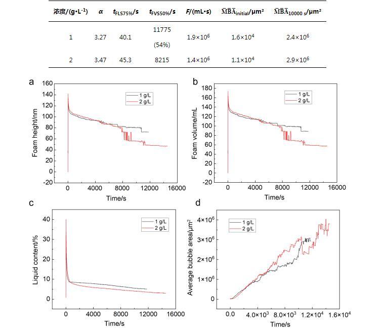 實(shí)驗(yàn)結(jié)果表明,1 g/L的C72-MPB和2 g/L的C72-MPB的表面活性劑溶液發(fā)泡倍數(shù)分別為3.3和3.5(見(jiàn)表4),屬于低倍泡沫液,不同濃度下泡沫高度與泡沫體積隨時(shí)間變化見(jiàn)圖4a,4b.