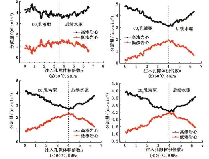 相比于高滲巖心,低滲巖心中由于毛管力較大,使得CO2乳液液滴與液膜之間的壓差大,導(dǎo)致CO2乳液易發(fā)生破裂而形成氣竄,減弱了CO2乳液的封堵性能,從而降低了流動阻力,同時乳液更傾向于進入高滲巖心,在巖心滲流過程中疊加的賈敏效應(yīng)會使高滲巖心的滲流阻力不斷增加,直至大于低滲巖心的滲流阻力,依據(jù)這一機制CO2乳液能夠?qū)崿F(xiàn)分流作用。