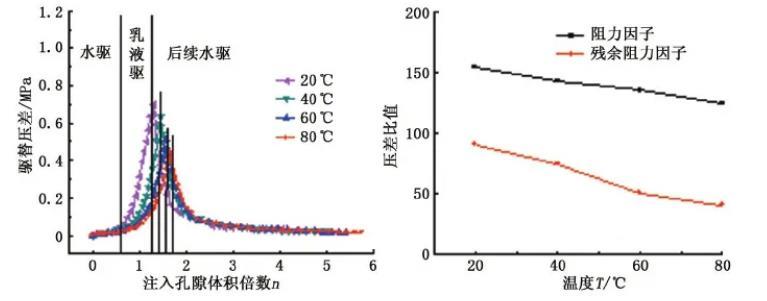 從圖9可以看出,隨著壓力的升高,阻力因子和殘余阻力因子均逐漸增強,說明形成的乳液性質(zhì)大幅提高,之后隨壓力的升高增幅變小。這是由于隨著壓力的升高,CO2乳液界面黏彈性增加,乳液穩(wěn)定性增強,乳液的強度及抗沖刷能力提高,且CO2密度也隨著壓力的升高而增大,因此乳液的表觀黏度增加較為明顯,從而提高了乳液的封堵能力。
