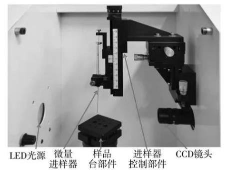 實驗采用SL200A型接觸角儀來產生液滴,獲取液滴圖像。該儀器的主機如圖2所示,主要組成部件為:光源控制部件(可調亮度LED光源)、CCD鏡頭(75 mm焦距,25幀/秒)、進樣器控制部件(可升降12.5 mm,0.01 mm微距)、樣品臺部件(樣品臺面50×50 mm)、圖像采集卡(25幀/秒)、手動控制微量進樣器(10、25、50μL)。實驗采用表面張力與接觸角分析系統的CAST2.0軟件控制拍攝過程。采用連續拍攝方式,圖像采集速率為25幀/s,連拍100幀,獲取液滴圖像。實驗樣品為黏度系數為50 mm2/s、100 mm2/s、350 mm2/s、500 mm2/s的硅油,其中黏度系數為50 mm2/s、100 mm2/s的硅油密度σ為965 kg/m3,黏度系數為350 mm2/s、500 mm2/s的硅油密度σ為970 kg/m3[14]。