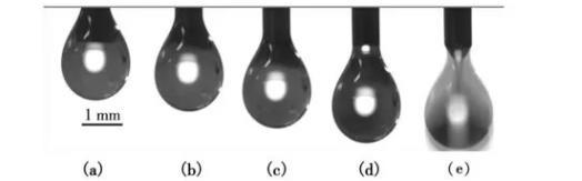 由于液滴形態是影響表面張力測量準確度的重要因素,液滴的控制與選擇是提高測量準確度的關鍵步驟。圖3為采用10μL微量進樣器緩慢增加液體量時的液滴形態照片,樣品為黏度系數50 mm2/s的硅油,其中圖3(a)為液滴剛形成時的形態圖像,圖3(d)為液滴下落前平衡時的形態圖像,圖3(e)為液滴下落時的形態圖像。根據照片得到懸停液滴的形狀因子S=ds/de分別為:(a)0.746;(b)0.744;(c)0.744;(d)0.739,因此,隨著液滴中液體量的增加,懸滴從近球形變化為橢球形,形狀因子稍稍減小。根據式(3)計算得到不同液滴形態下的硅油表面張力系數,分別為:(a)0.019 1 N/m、(b)0.019 2 N/m、(c)0.019 5 N/m、(d)0.019 7 N/m。由此可見,對于同一種液體,當液滴處于不同形態時,計算得到的表面張力系數存在差別。根據文獻[14],黏度系數50 mm2/s的線性結構甲基硅油的表面張力系數為0.020 5 N/m,因此,對于不同形態的液滴,測量的相對誤差分別為:(a)6.8%;(b)6.3%;(c)4.9%;(d)3.9%。結果表明,當液滴達到下落前的臨界狀態時,測量的相對誤差最小。實驗還采用了25、50μL的微量進樣器來產生液滴,發現由于每次液體量的增加較多,表面張力和重力相平衡的臨界狀態較難控制,難于形成較好的懸滴。因此,采用懸滴法測量液體表面張力系數時,通過小容量(例如10μL)的微量進樣器控制液滴形態,選擇液滴下落前平衡時的形態圖像,可以減小測量的相對誤差,獲得接近真實值的表面張力系數。