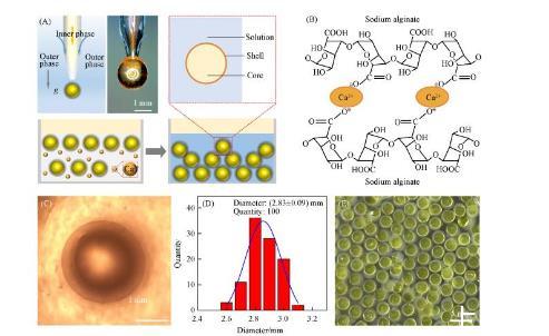 為了實現(xiàn)一步法制備大小均勻、尺寸可控、壁厚可調(diào)、生物相容的水/水微囊,需要設(shè)計同軸微流控器件,如圖1(A)所示。內(nèi)相黃原膠水溶液由內(nèi)管注入微流控器件;外相海藻酸鈉水溶液,由外管注入微流控器件。內(nèi)相在外相的剪切下形成液滴,同時外相在重力作用下脫離管口生成水包水的水/水微囊,并進一步通過鈣離子交聯(lián)海藻酸鈉水凝膠網(wǎng)絡(luò),如圖1(B)所示。由于微流控器件對內(nèi)外相的精準調(diào)控,水/水微囊在光學(xué)顯微鏡下具有清晰穩(wěn)定的核殼結(jié)構(gòu)圖1(C),平均尺寸(D)為(2.83±0.09)mm圖1(D)。該方法制備水/水微囊具有器件結(jié)構(gòu)簡單、操作便捷、一步法成型、微囊尺寸均一可控、核殼結(jié)構(gòu)穩(wěn)定、無需后處理等優(yōu)點圖1(E)。
