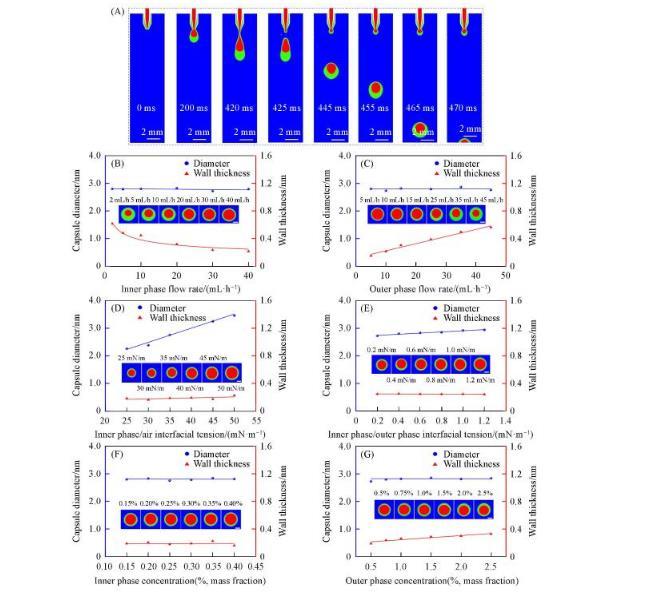 數(shù)值模擬與實驗結(jié)果具有較好的一致性,數(shù)值模擬內(nèi)相/外相流速對水/水微囊直徑和壁厚的影響,得出了與實驗數(shù)據(jù)一致的規(guī)律,即水/水微囊的直徑基本不隨內(nèi)相/外相流速的變化而變化,而水/水微囊壁厚隨內(nèi)相流速增加或外相流速減小都將減小,如圖4(B)和(C)所示。與實驗相比,數(shù)值模擬可以更系統(tǒng)地調(diào)節(jié)各個參數(shù),如外相/空氣界面張力、內(nèi)相/外相界面張力對微囊直徑和壁厚的影響。隨著外相/空氣界面張力的增加,水/水微囊直徑成比例增加,這是由于外相/空氣界面張力使微囊懸掛在管口,重力使微囊脫離管口,當外相/空氣界面張力增加,需要的重力相應(yīng)增加,造成水/水微囊直徑增加。當內(nèi)相/外相界面張力增大時,水/水微囊直徑略有增加。