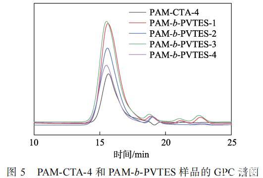 圖5為不同n(VTES)∶n(AM)合成的PAM-b?PVTES樣品的GPC譜圖,結(jié)果列于表2。PAM-b?PVTES樣品的相對分子質(zhì)量分布相較于PAM-CTA-4的相對分子質(zhì)量分布變大,且隨著VTES用量的增加,聚合物鏈段增長,PAM-b-PVTES的Mw從9058增加到10707。