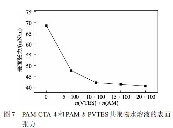 從圖7可以看出,隨著VTES用量的增大,共聚物水溶液的表面張力逐漸降低,n(VTES)∶n(AM)由0增加到10∶100時,共聚物水溶液表面張力從68.49 mN/m降低到40.44 mN/m,繼續(xù)增大VTES用量,共聚物水溶液表面張力逐漸趨于穩(wěn)定。這說明VTES和AM共聚后賦予了共聚物水溶液更低的表面能,降低了共聚物水溶液的表面張力。