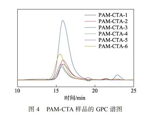 從表1可知,隨著DBTTC用量的降低,共聚物相對分子質(zhì)量逐漸增加,重均相對分子質(zhì)量(Mw)由5755增加到10505。這是因為,隨著鏈轉(zhuǎn)移劑DBTTC用量的增加,反應(yīng)體系中DBTTC的濃度增加,鏈增長自由基與鏈轉(zhuǎn)移劑DBTTC反應(yīng)生成休眠中間體,鏈增長停止,PAM-CTA的相對分子質(zhì)量隨著鏈轉(zhuǎn)移劑用量的增加而降低,實現(xiàn)對PAM-CTA相對分子質(zhì)量的可控合成。由于PAM-CTA-4的分子量分布最窄,因此,選擇PAM-CTA-4進(jìn)行下一步反應(yīng)。
