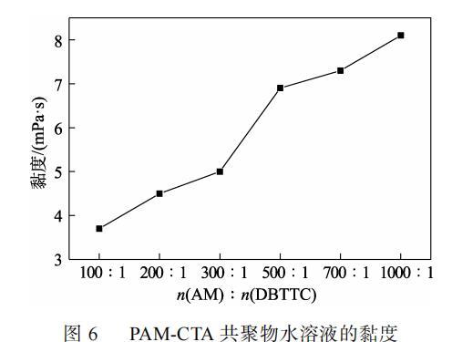 由圖6可知,隨著DBTTC用量的減少,共聚物水溶液黏度緩慢提升,由3.7 mPa·s逐漸升高到8.1 mPa·s,這是因為,隨著RAFT試劑用量的減少,共聚物相對分子質(zhì)量增加,共聚物鏈段增長,共聚物鏈段之間的纏繞作用增強(qiáng),共聚物水溶液黏度升高。適當(dāng)?shù)卣{(diào)節(jié)RAFT試劑的用量可以達(dá)到控制共聚物水溶液黏度的目的。