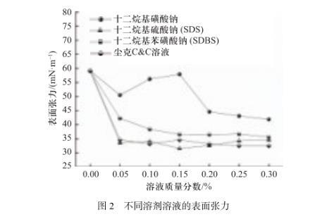 如圖2所示,4種溶液隨著濃度的增加,表面張力逐漸趨于穩定。十二烷基磺酸鈉溶液質量分數大于0.20%時,溶液表面張力趨于穩定。表面張力最小時,溶液質量分數為0.30%.十二烷基硫酸鈉(SDS)溶液質量分數大于0.05%時,溶液表面張力趨于穩定。表面張力最小時,溶液質量分數為0.15%.十二烷基苯磺酸鈉(SDBS)質量分數大于0.15%時,溶液表面張力趨于穩定。表面張力最小時,溶液質量分數為0.30%.塵克C&C溶液質量分數大于0.05%時,溶液表面張力趨于穩定。表面張力最小時,溶液質量分數為0.10%.由圖可以看出,相較于十二烷基苯磺酸鈉(SDBS)和十二烷基磺酸鈉,十二烷基硫酸鈉(SDS)和塵克C&C可以較大程度地降低溶液的表面張力,提高溶液對低水分無煙煤顆粒的濕潤性。同時,考慮到塵克C&C溶液具有無腐蝕、無污染、可生物降解、不造成二次污染的特性,最終選擇質量分數0.10%塵克C&C溶液作為最優表面活性溶液。