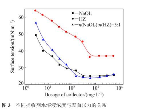 表面張力是影響浮選過程中氣泡的穩(wěn)定性,以及氣泡形成難易程度的主要參考數(shù)據(jù),臨界膠團濃度(簡稱CMC)是反映表面活性劑降低水溶液表面張力的效率。組合用藥的浮選效果優(yōu)于單一用藥,這可能與其在水溶液中的表面張力有一定的關(guān)系。圖3所示為最佳pH條件下(pH=9.0)組合捕收劑與兩種單一捕收劑的水溶液濃度與表面張力的關(guān)系。NaOL在水中微量的添加顯著地降低了水的表面張力,而隨著NaOL濃度的增加,溶液的表面張力逐漸下降,在濃度為302 mg/L時溶液的表面張力達(dá)到最低,為22.7~24.8 mN/m。此后NaOL濃度的增加并不能顯著地降低水的表面張力,所以可以確定NaOL的CMC值約為302 mg/L,與文獻(xiàn)中報道的1.03×10?3mol/L(308 mg/L)接近。而HZ的CMC值568 mg/L,表面張力36.37 mN/L。作為一種表面活性劑,其表面活性明顯不如NaOL,在較高濃度下,HZ才能形成膠團。浮選HZ用量為200 mg/L,低于其CMC值,在此濃度下,膠團未形成,表面張力較高,起泡性不佳,在單礦物浮選試驗中表現(xiàn)出了泡沫量小的特點。組合捕收劑水溶液的表面張力測試結(jié)果表明,CMC值約為150 mg/L,CMC值下水溶液表面張力為24.88 mN/m。可見HZ的添加能降低NaOL的CMC值,這可能是NaOL作為一種陰離子型表面活性劑,親水“離子頭”之間的靜電作用較強,非離子表面活性劑的“插入”到親水“離子頭”之間,同時亞氨基也存在一定程度的解離,使得離子之間的靜電斥力減小。