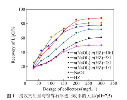 圖1捕收劑用量與鋰輝石浮選回收率的關(guān)系(pH=7.5)
