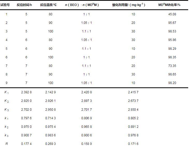 (1)以三氯化釕為催化劑,BEO和MDHM為原料,成功合成了目標產物BEOTSS;采用正交試驗優化了催化反應條件:催化劑用量30 mg/kg,n(BEO)∶n(MDHM)為1.05∶1,反應時間6.0 h,反應溫度100℃,在此工藝條件下MDHM轉化率可達99%。