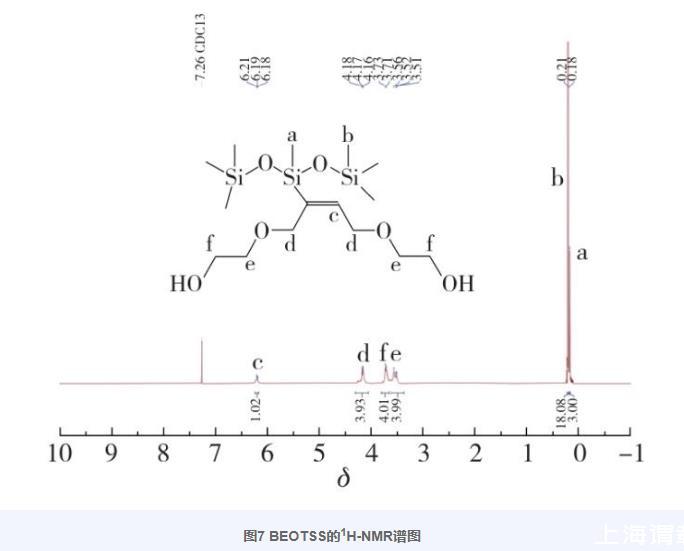 圖7為BEOTSS的1H-NMR譜圖。根據譜圖中的化學位移及積分數據確定化合物中各基團的氫歸屬,得到以下結果:1H-NMR(400 MHz,CDCl3),δ=6.24~6.16(m,—C=CH—,1H),4.17(m,—CH 2CCHCH 2—,4H),3.72(d,J=5.6 Hz,—CH 2—OH,4H),3.54(t,J=14.6 Hz,—O—CH 2—,4H),0.21(s,—Si(CH 3)3,18H),0.18(s,—SiCH 3,3H)。由于使用氘代氯仿作為溶劑,產物中的2個—OH為活潑氫,在譜圖中沒有出峰,同時結合紅外譜圖分析,進一步證明本研究成功合成了目標化合物BEOTSS。