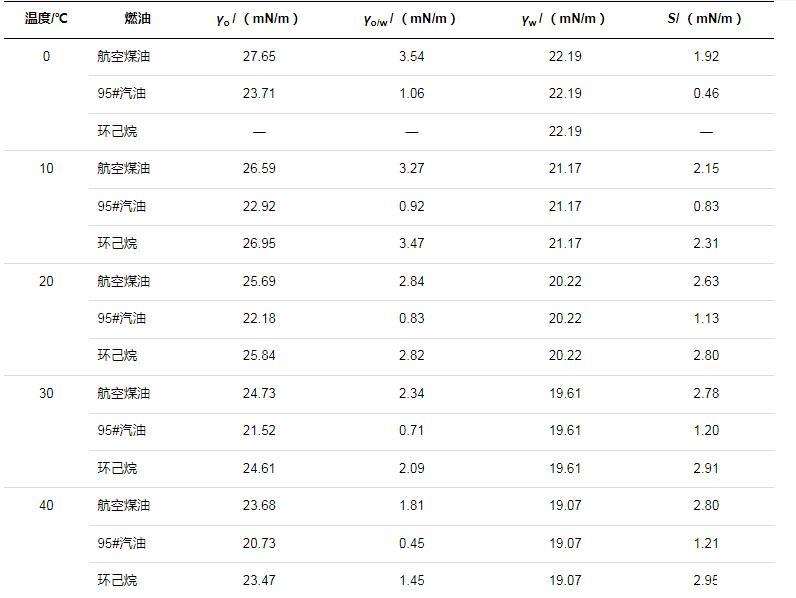 式中,S為鋪展系數;γo為燃油的表面張力,mN/m;γw為表面活性劑溶液的表面張力,mN/m;γo/w為燃油與表面活性劑溶液之間的界面張力,mN/m。