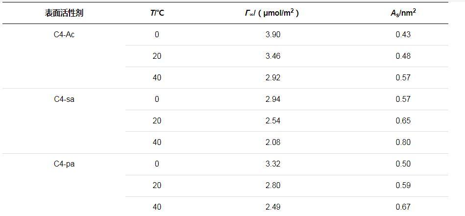 通常較高的Γ∞和較低的AS值表明表面活性劑分子密集地排列在空氣與水的界面上,由上述公式計算得到三種表面活性劑的Γ∞和較低的AS值如表2所示。對比參數可知,同種表面活性劑的Γ∞均隨溫度的升高而減小,AS有所增大,吸附表面的分子排布較為松散。這是由于溫度較高的情況下表面活性劑分子熱運動加劇,更易從吸附界面上脫離,并且因無規(guī)則運動導致吸附分子所占面積增大了。溫度升高導致溶解度的增加,因而表面的Γ∞會有所減小。由于Γ∞還受到表面張力隨濃度變化曲線斜率的影響,因此所得趨勢是綜合影響的結果。此外,由表中還可以看出,C4-sa分子的Γ∞最小,AS最大,在溶液表面的排列更加松散。這可能是由于親水端磺酸基團之間強靜電排斥力,并且空間位阻較大。