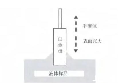 本試驗表面張力值采用吊板法測量,如圖1所示:白金板因被測溶液的表面張力而將其向下拉,當總表面張力與液體的重量平衡時,通過測量白金板浸入待測溶液的深度,便可知溶液的表面張力值,其原理見式(1)。