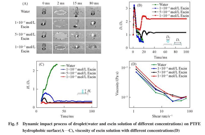 液滴在固體表面的彈跳行為由液體性質(zhì)和固體表面性質(zhì)共同決定,通常對于特定場景,固體表面性質(zhì)多是固定不變的,因此主要通過改變液體的性質(zhì)(黏度、表面張力)來調(diào)控液滴的彈跳行為.為了考察七葉皂素抑制液滴回縮過程中,液體黏度是否起到一定作用,測定了水和不同濃度七葉皂素溶液的黏度.如圖5(D)所示,所有樣品的黏度隨剪切速率的增加會先下降后達到平衡,不同樣品的黏度結(jié)果相似,無明顯差異。