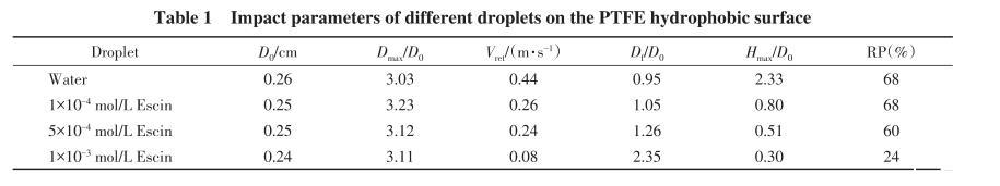 從圖5(B)和(C)及表1可以看出,不同液滴在疏水表面上發(fā)生撞擊后均發(fā)生相似程度的鋪展,之后發(fā)生回縮.水滴回縮速率(0.44 m/s)較大,且回縮百分比達到68%.向水中加入少量七葉皂素,濃度為1×10-4mol/L時,回縮速率(0.26 m/s)明顯降低,但回縮百分比沒有明顯改善.隨著七葉皂素濃度增大,液滴回縮明顯減弱.濃度為1×10-3mol/L時,回縮速率低至0.08 m/s,且僅液滴的24%發(fā)生回縮,可以認為達到了很好的抑制回彈的效果.而考察彈跳情況時發(fā)現(xiàn),水滴因完全彈起離開表面,所以Hmax/D0最高達到2.33.與之相比,七葉皂素加入后,明顯抑制了液滴的彈起,且隨著濃度增大,抑制作用明顯增加.