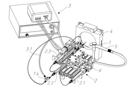 1、雙鞘液管路模塊;1.1、外鞘液不銹鋼管;1.2、內(nèi)鞘液石英毛細(xì)管;1.3、樣品石英毛細(xì)管;1.4、三通;1.41、第一T型三通;1.42、第二T型三通;1.5、外鞘液;1.6、內(nèi)鞘液;1.7、樣品液;1.8、液錐噴霧;2、集成化微流量泵控模塊;2.1、集成化微流量泵控模塊一;2.11、步進(jìn)電機(jī);2.12、絲桿;2.13、聯(lián)軸器;2.14、魯爾接頭玻璃注射器;2.15、圓接頭;2.2、集成化微流量泵控模塊二;2.3、集成化微流量泵控模塊三;3、高壓電勢(shì)加載模塊;3.1、高壓輸出導(dǎo)線;4、質(zhì)譜接口連接模塊;5、數(shù)碼顯微鏡組件;6、空間位置微調(diào)組件;6.1、三軸臺(tái);6.2、M3螺絲;6.3、T型螺母。