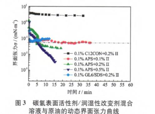 圖3碳氫表面活性劑/潤濕性改變劑混合溶液與原油的動態(tài)界面張力曲線