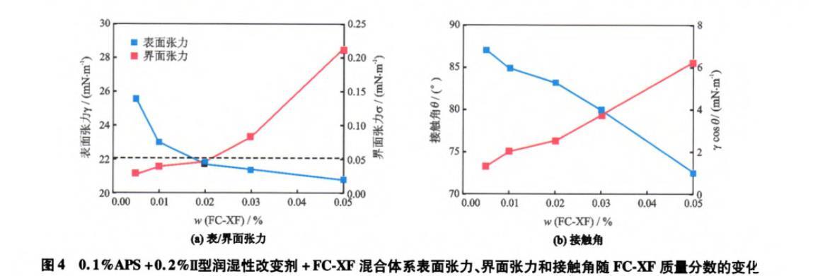 從圖4(b)中可以看出,隨著FC-XF質(zhì)量分數(shù)由0.005%增加到0.050%,混合體系與巖石的接觸角由87°降低至73°,γcosθ由1.3 mN/m上升到6.3 mN/m。這是由于吸附Ⅱ型潤濕性改變劑和APS使得巖石表面由水濕轉(zhuǎn)變?yōu)橹行詽櫇?接觸角>87°),更易于吸附FC-XF的碳氟鏈而使親水性頭基在巖石表面暴露,增加了巖石表面的親水性,因而隨著FC-XF質(zhì)量分數(shù)的增加接觸角減小。
