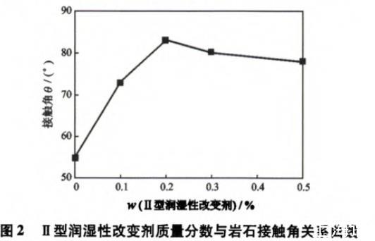 圖2為Ⅱ型潤濕性改變劑質(zhì)量分數(shù)與巖石的接觸角之間的關(guān)系。從圖2可以看出,隨著Ⅱ型潤濕性改變劑質(zhì)量分數(shù)的增加,接觸角由55°逐漸增大,當加入0.2%Ⅱ型潤濕性改變劑時接觸角可達到83°,繼續(xù)增加濃度接觸角略有減小,但都大于75°。