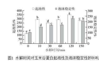 圖1水解時(shí)間對(duì)玉米谷蛋白起泡性及泡沫穩(wěn)定性的影響