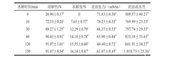 表1水解時(shí)間對(duì)玉米谷蛋白溶解性、水解度、表面張力和表面疏水性的影響