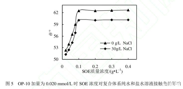 圖5 OP-10加量為0.020 mmol/L時SOE濃度對復(fù)合體系純水和鹽水溶液接觸角的影響