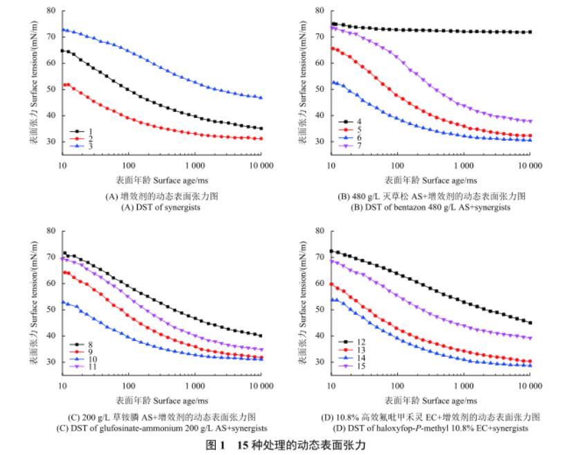 測定結果如圖1(A)所示:處理2降低表面張力的速度最快,且在10 000 ms時表面張力達到最小值,處理3降低表面張力的速度最慢,說明2#增效劑的效果最好,3#增效劑最差。與未添加增效劑的處理(4,8,12)相比,添加增效劑后除草劑表面張力的降低速度更快,10 000 ms時所達到的靜態(tài)表面張力值也更小,其中也是2#增效劑的效果最好。