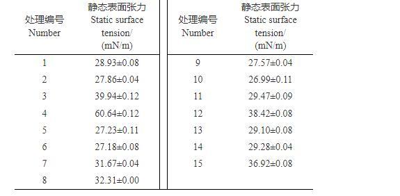 1.2.1靜態(tài)表面張力測定參照文獻方法測定。在(25±1)℃下,用0.3 mm的鉑金環(huán)(外徑20.30 mm,周長61.89 mm,密度0.998 g/mL)在全自動張力儀上先用純水進行校準,然后測定表1中15種處理的靜態(tài)表面張力,每個試驗至少重復3次,結果取平均值,用Origin Pro軟件(9.0版,OriginLab公司)處理數據。