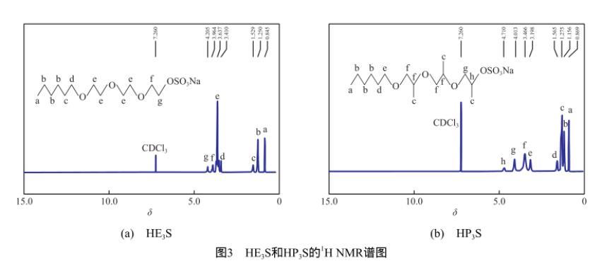 圖3為HE3S和HP3S的1H NMR譜圖。由于在合成過(guò)程中HE3和HP3為混合物,氫原子的化學(xué)位移(δ)會(huì)發(fā)生堆積,只能通過(guò)積分面積與δ確定特征基團(tuán)的氫原子個(gè)數(shù),而不能確定其裂峰[11]。由圖3(a)可知,δ=0.845(3H,—CH3),1.250(6H,—CH2—),1.529(2H,—CH2—),3.410(2H,—CH2O—),3.637(8H,—OCH2CH2O—),3.964(2H,—OCH2—),4.205(2H,—CH2OSO3Na),7.260(CDCl3)。由圖3(b)可知,δ=0.869(3H,—CH3),1.156(6H,—CH2—),1.275(9H,—CH3),1.565(2H,—CH2—),3.198(2H,—CH2O—),3.466(6H,—OCH2CH—O—),4.0 1 3(2 H,—O C H2—),4.7 1 0(1H,—CH—OSO3Na),7.260(CDCl3)。