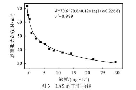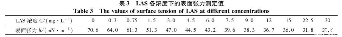 LAS是應(yīng)用最廣泛的陰離子表面活性劑,是我國(guó)合成洗滌劑活性物的主要構(gòu)成,可用作洗衣粉、香波、金屬清洗劑、脫墨劑等產(chǎn)品的原料,分析其生物降解性能十分必要。LAS試樣在不同濃度時(shí)測(cè)定的表面張力結(jié)果見(jiàn)表3。