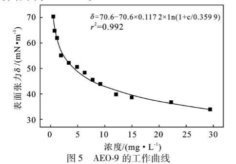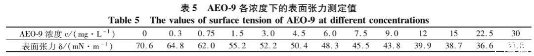 脂肪醇聚氧乙烯醚(AEO-9)是一種非離子表面活性劑,該類表面活性劑是非離子表面活性劑中發(fā)展最快、用量最大的品種。AEO-9試樣的表面張力測(cè)定結(jié)果見(jiàn)表5。