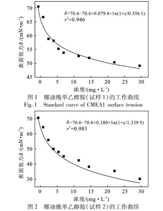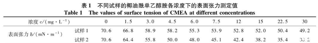 椰油酰單乙醇胺溶液的表面張力測(cè)定結(jié)果見(jiàn)表1。