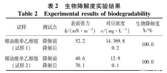 不同批次的椰油酰單乙醇胺試樣經(jīng)過(guò)降解后利用表面張力法測(cè)定其降解液的表面張力值,根據(jù)生物降解度公式計(jì)算得出降解度,測(cè)定結(jié)果見(jiàn)表2。其中空白降解試驗(yàn)液降解前與降解后的表面張力值分別是69.5、68.2mN/m,而試樣溶液在降解后測(cè)定的表面張力值均大于空白降解試驗(yàn)液降解后的表面張力值68.2mN/m,導(dǎo)致帶人工作曲線計(jì)算出的降解后試樣溶液的濃度(c終)小于降解后空白降解試驗(yàn)液的濃度(c空),根據(jù)公式要求,當(dāng)c終小于C空時(shí),差值以零計(jì),因此最終計(jì)算出的生物降解度為100.0%。