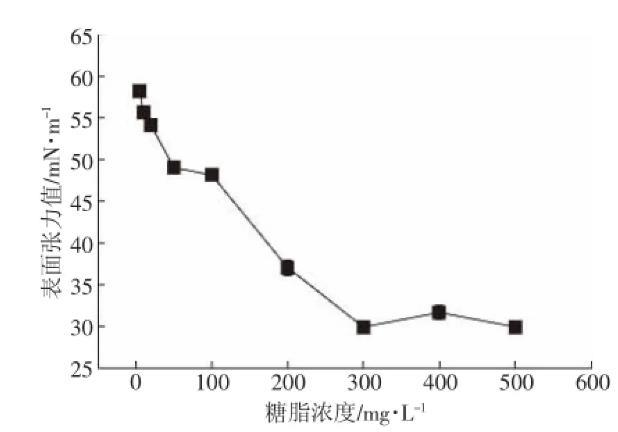 發(fā)酵產(chǎn)物臨界膠束濃度是指分子在溶劑中締合形成膠束的最低濃度。臨界膠束濃度(Critical micelle0.005 concentration,CMC)可以作為表面活性劑表面活性的一種度量,CMC越小,改變表/界面性質(zhì),起到增溶、乳化等所需的濃度就越低。從圖3可以看出:糖脂在0~300 mg·L-1時(shí),表面張力值隨著糖脂濃度的升高而降低,且在300 mg·L-1時(shí)達(dá)到最小值;在300~500 mg·L-1時(shí),表面張力值變化不大??傻冒l(fā)酵粗提產(chǎn)物的CMC為300 mg·L-1,明顯低于普通化學(xué)表面活性劑十二烷基磺酸鈉(SDS)的2200 mg·L-1,能在較低濃度下使用,因而在醫(yī)藥、食品、化工等行業(yè)具有廣闊應(yīng)用前景。