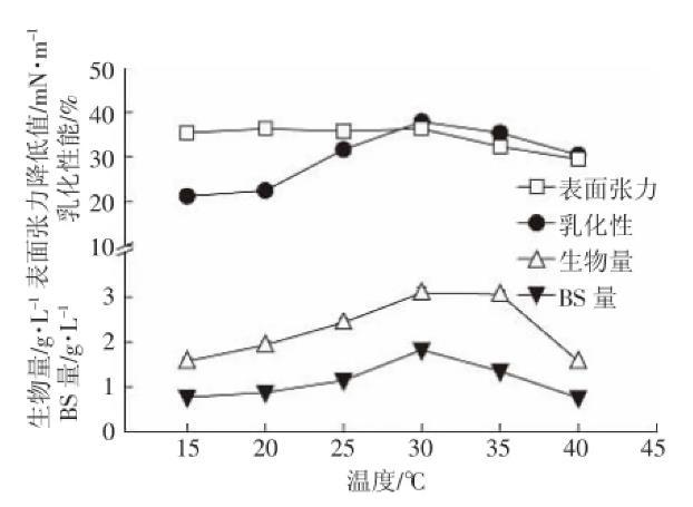 溫度是影響菌株發酵產物產量的重要環境因素之一。不同細菌的最適生長溫度不同。一般細菌在4℃停止生長,在30℃左右生長良好。已報道的銅綠假單胞菌(Pseudomonas aeruginosa)最適溫度一般在27~37℃。由圖4可以看到,表面張力值、生物量和生物表面活性劑產量都隨著溫度的升高呈現先升高后降低的趨勢,在30℃時達到最大。乳化性在15℃到30℃時保持相對穩定,在30℃到40℃時乳化性降低。實際上大多數銅綠假單胞菌的最佳培養溫度都在27~37℃,與實驗結果相符。