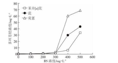 圖8是水相中多環芳烴(苯并[a]芘、芘、熒蒽)的表觀溶解度隨著生物表面活性劑濃度的變化曲線,當生物表面活性劑濃度大于300 mg·L-1時,各多環芳烴的濃度隨生物表面活性劑濃度增大而增大。這是由于生物表面活性劑在CMC(臨界膠束濃度)以上時會形成膠束,而膠束內的疏水性微環境對疏水性有機溶劑具有較強的分配作用,可顯著增大溶質的表觀溶解度[40];當生物表面活性劑濃度低于CMC時,生物表面活性劑分子以單體形式存在,單分子的表面活性劑對被增溶物的分配作用很弱,因而各多環芳烴在水中的溶解度變化不大或者輕微增加。