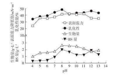 pH值也是影響菌株發酵產物產量的因素之一。由圖5可見,細菌的生物量在pH=8的時候達到最大,且在pH8~10的時候基本平穩;表面張力值、生物表面活性劑含量與乳化性均在pH=8的時候達到最大值,兩側均有不同程度的下降。因此該菌株傾向偏堿性的條件生存,與強婧等篩選的Pseudomonas aeruginosa S6最適pH一致。綜合其他報道的生物表面活性劑產生菌的最適pH范圍,大部分微生物都在pH6.2~8之間。