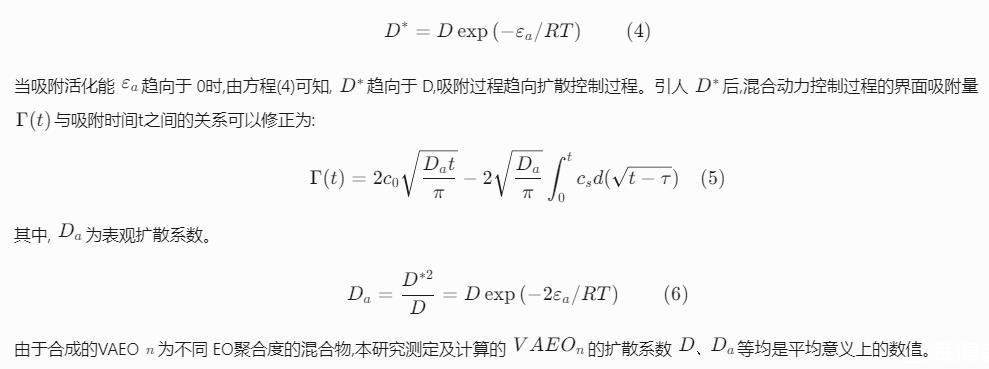擴散控制的吸附過程,表面活性劑分子由濃度差驅(qū)使進入新表面,不存在吸附勢壘。Word-Tordai方程描述了界面吸附量Г(t)與吸附時間t的關(guān)系:Г(t)=2c0Dtπ-2Dπ∫t0csd(t-τ)(1)式中,c0是溶液本體表面活性劑濃度,mol/L,D是單分子擴散系數(shù),m2/s,cs是次表面表面活性劑濃度,mol/L,τ是整合虛設(shè)變量。方程(1)不能直接求解,可通過極限法求解。在t→0時,表面張力γ(t)近似于溶劑表面張力γ0,表面吸附接近平衡時,γ(t)近似于靜態(tài)表面張力γeq.Fainerman等用漸近的方法對方程(1)進行轉(zhuǎn)化:γ(t→0)=γ0-2nRTc0Dtπ(2)γ(t→∞)=γeq+nRTГ2eqcπ4Dt(3)方程(3)中,t→∞時,c=c0,Γeq表示靜態(tài)表面張力達到平衡時的表面吸附量?;旌蟿恿U散吸附是指表面活性劑分子從本體擴散到次表面仍然遵循擴散機理,但從次表面層擴散到表面層時需克服一定的勢壘。Liggieri和Ravera[15,16]提出,次表面層中的分子,只有能量大于吸附活化能εa才能被吸附到表面,已吸附的分子,只有能量大于解吸活化能εb才能被解吸。以Word-Tordai方程為基礎(chǔ),引入矯正擴散系數(shù)D?。矯正擴散系數(shù)D?和擴散系數(shù)D關(guān)系定義為:D?=Dexp(——εa/RT)(4)當吸附活化能εa趨向于0時,由方程(4)可知,D?趨向于D,吸附過程趨向擴散控制過程。引入D?后,混合動力控制過程的界面吸附量Г(t)與吸附時間t之間的關(guān)系可以修正為:Г(t)=2c0Datπ-2Daπ∫t0csd(t-τ)(5)其中,Da為表觀擴散系數(shù)。Da=D?2D=Dexp(——2εa/RT)(6)由于合成的VAEOn為不同EO聚合度的混合物,本研究測定及計算的VAEOn的擴散系數(shù)D、Da等均是平均意義上的數(shù)值。