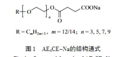 表面活性劑是一類應(yīng)用廣泛的有機化合物,極少的用量就能顯著提高溶液的性能,因此,表面活性劑的研究具有重要的現(xiàn)實和理論意義。其中,陰離子和非離子型表面活性劑的用量最多且應(yīng)用最為廣泛,它們具有優(yōu)異的去污性、水溶性、耐熱性、耐鹽性及制備成本低和環(huán)境友好等優(yōu)點。然而,傳統(tǒng)的表面活性劑分子通常只包含一個親水頭基和一個疏水尾鏈,很難同時具有陰離子和非離子表面活性劑的特性。值得一提的是,脂肪醇醚琥珀酸酯鹽(AEnCE-Na,n=3,5,7,9)是一種新型的表面活性劑,結(jié)構(gòu)通式如圖1所示。結(jié)構(gòu)決定性質(zhì),因此,可以推斷AEnCE-Na具有許多優(yōu)異的性能:1)一個分子中同時存在兩個親水基團(EO鏈和陰離子頭基)和一個疏水基團(烷基碳鏈),使其具有優(yōu)異的表面活性、乳化性和發(fā)泡性;2)分子中的酯基在水解后可形成具有優(yōu)異生物降解性的非離子表面活性劑和鹽,因此,該類表面活性劑安全且環(huán)保,符合當代“綠色化”的發(fā)展理念;3)直鏈表面活性劑比支鏈表面活性劑具有更好的自降解能力。然而,目前對于脂肪醇醚琥珀酸酯鹽表面活性劑的研究甚少。