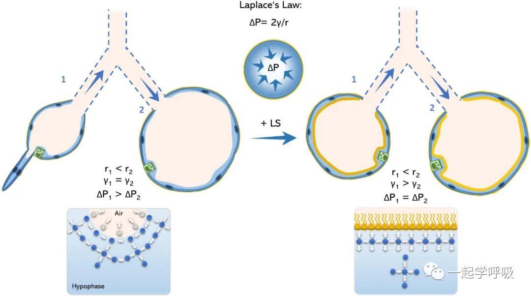 ▲肺泡Laplace定律的示意模型。理想球形肺泡的內(nèi)壓由Laplace定律定義為ΔP=2γ/r。因此,小半徑的肺泡(肺泡1)相對(duì)于大半徑的肺泡(肺泡2)具有更高的內(nèi)壓。在沒有功能性表面活性劑膜的情況下,肺泡1傾向于向肺泡2塌陷,這就允許了肺泡大小的不均勻性。然而,在表面活性劑的存在下,由于水-水-和水-空氣相之間均勻產(chǎn)生分子間力,避免了氣-液界面的彎曲并避免了肺泡塌陷,表面張力降低。LS是肺表面活性劑。