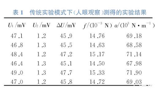 人眼直接觀察數(shù)字電壓表,記錄金屬環(huán)拉斷液柱前的瞬間數(shù)字電壓表讀數(shù)U1和拉斷液柱后數(shù)字電壓表的讀數(shù)U2;測得的數(shù)據(jù)如表1所示。