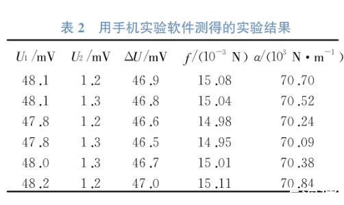 利用改裝后的液體表面張力系數(shù)測量儀和手機(jī)實(shí)驗(yàn)軟件記錄實(shí)驗(yàn)數(shù)據(jù),實(shí)驗(yàn)數(shù)據(jù)可在手機(jī)屏幕實(shí)時(shí)顯示,拖動手機(jī)屏幕找到“拉斷液柱”時(shí)所對應(yīng)的數(shù)據(jù),測得的U1和U2數(shù)據(jù)如表2所示。