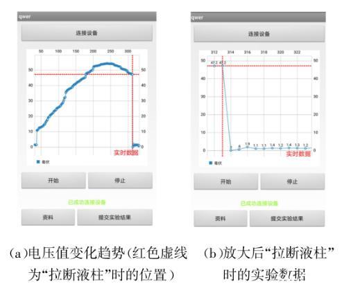 2)手機(jī)實(shí)驗(yàn)軟件能將實(shí)驗(yàn)中所采集到的所有數(shù)據(jù)以坐標(biāo)點(diǎn)的形式描繪出電壓變化圖,在智能手機(jī)端可以方便地觀察到實(shí)驗(yàn)過程中表面張力的變化趨勢,使學(xué)生能深入了解實(shí)驗(yàn)過程中各個階段拉力的具體變化情況,從而可以更好地理解實(shí)驗(yàn)原理和實(shí)驗(yàn)過程。